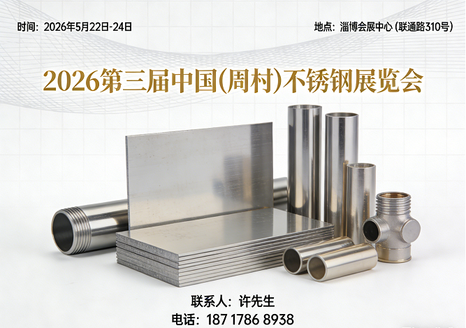 由中国钢铁工业协会不锈钢分会、山东省不锈钢行业协会、淄博市周村不锈钢行业协会、上海钢联电子商务股份有限公司主办,的“2026第三届中国(周村)不锈钢展览会于2026年5月22日-24日在淄博会展中心举办。此次活动邀请了全产业链企业参展,同时邀请各地不锈钢行业协会的领导专家、不锈钢产业链领军企业高管、知名经济学家、行业研究人员及众多企业代表人士共聚一堂,与各行业同仁一同探讨当前不锈钢行业的机遇与挑战。