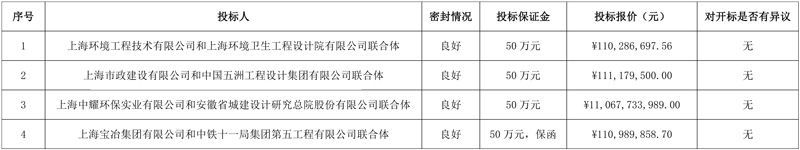 第一中标候选人:上海环境工程技术有限公司和上海环境卫生工程设计院有限公司联合体,投标报价:110286697.56元;