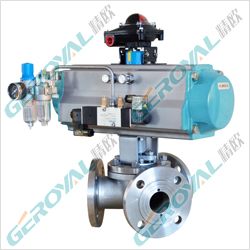 气动Y型三通球阀有相互成120°和两通孔成135°,根据需要可实现对介质流向切换,能比相互垂直的两个通道三通球阀流阻更小。气动Y形三通球阀由气动执行机构和Y形三通球阀组成。