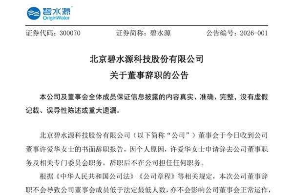 北京碧水源科技股份有限公司(简称:碧水源)公告称,近日,公司董事会收到董事许爱华女士的书面辞职报告,因个人原因,许爱华女士申请辞去公司董事职务及相关专门委员会职务,辞职后不在公司担任任何职务。其原定任期届满日为2027年4月1日。 碧水源表示,截至本公告披露日,许爱华女士未持有公司股份。许爱华女士在公司担任董事期间勤勉尽责,为公司规...