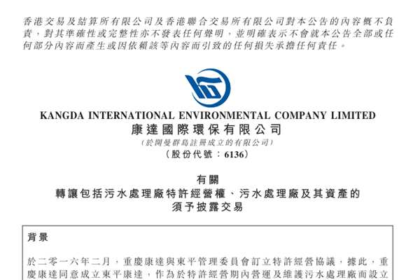 近日,港股上市公司康达环保发布须予披露交易公告,其间接全资附属公司东平康达(作为转让方)、东平县泰达(作为受让方)与东平管理委员会订立协议,据此,东平康达同意出售,而东平县泰达同意代表东平县政府购回相关资产,代价约为人民币1.271亿元。 相关资产包括污水处理厂的特许经营权、污水处理厂及其所有资产、舞钢市政府结欠的污水处理费(含逾期...
