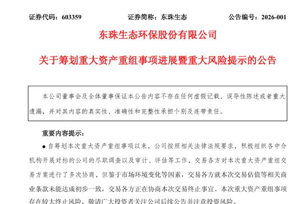 东珠生态环保股份有限公司(简称:东珠生态)于1月10日发布《关于筹划重大资产重组事项进展暨重大风险提示的公告》。公告显示,自筹划本次重大资产重组事项以来,东珠生态按照相关法律法规要求,积极组织各中介机构开展对标的公司的尽职调查以及审计、评估等工作,交易各方对本次重大资产重组交易方案进行了多次协商,但鉴于市场环境变化等因素,交易各方就本...
