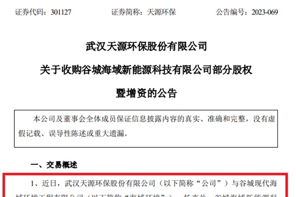 近日,武汉天源环保股份有限公司(简称:天源环保)发布公告,表示将收购谷城海域新能源科技有限公司(下称“海域新能源”)65%股权,并对其增资3828万元。 据介绍,海域新能源于2021年刚刚成立,主要从事固废资源化处理、污水处理、环境监测及新能源四大业务,截至2023年4月30日,净资产约3937.4万元。值得...