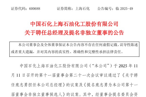 中国石化上海石油化工股份有限公司(下称:上海石化)公告称,公司于11月11日召开的第十一届董事会第二十一次会议审议通过了《关于聘任鹿志勇担任本公司总经理》的议案及《提名鹿志勇为本公司第十一届董事会非独立董事候选人》的议案。其中,经董事会提名委员会资格审查,董事会任命鹿志勇先生为本公司总经理,任期自2025年11月11日起至第十一届董事...