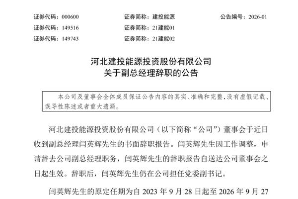 河北建投能源投资股份有限公司(简称:建投能源)公告称,公司近日收到副总经理闫英辉先生的书面辞职报告。闫英辉先生因工作调整,申请辞去公司副总经理职务,闫英辉先生的辞职报告自送达公司董事会之日起生效。辞职后,闫英辉先生仍在公司担任党委副书记。 闫英辉先生的原定任期为自2023年9月28日起至2026年9月27日第十届董事会任期届满之日止...