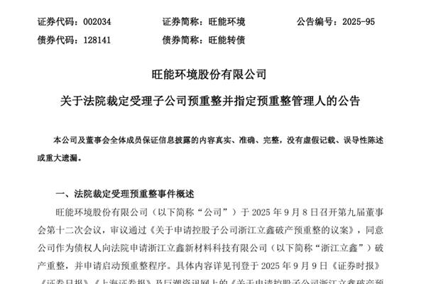 旺能环境股份有限公司(简称:旺能环境)公告称,11月12日,公司收到了德清法院送达的《决定书》(2025)浙0521 破申36号,同意浙江泽大(湖州)律师事务所担任浙江立鑫新材料科技有限公司(下称“浙江立鑫”)预重整期间的临时管理人。 据悉,9月8日,旺能环境,审议通过《关于申请控股子公司浙江立鑫破产预重整的...