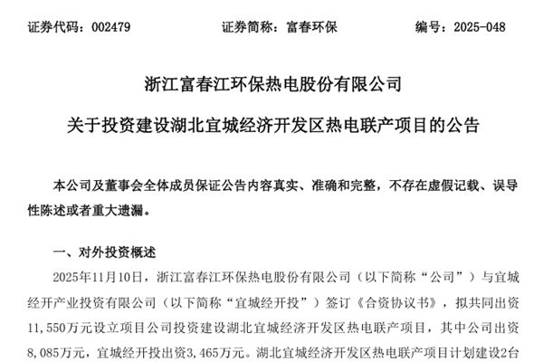 浙江富春江环保热电股份有限公司(简称:富春环保)近日公告称,公司与宜城经开产业投资有限公司(下称“宜城经开投”)签订《合资协议书》,拟共同出资11,550万元设立项目公司投资建设湖北宜城经济开发区热电联产项目,其中公司出资8,085万元,宜城经开投出资3,465万元。湖北宜城经济开发区热电联产项目计划建设2台1...