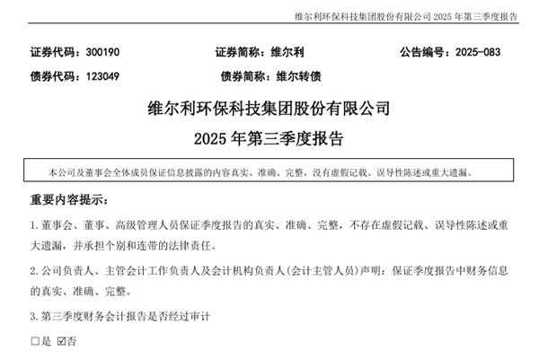 维尔利环保科技集团股份有限公司(简称:维尔利)近日发布《2025年第三季度报告》。2025年前三季度,维尔利实现营业收入为12.78亿元,同比下降12.29%;归母净利润为803.99万元,同比下降39.80%;扣非归母净利润为-92.47万元,同比增长98.82%;基本每股收益0.01元。图源:维尔利公告 2025年前三季度,维尔...