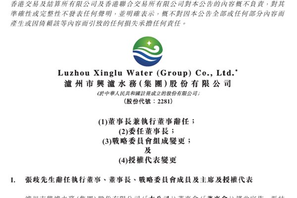 港股上市企业泸州市兴泸水务(集团)股份有限公司(简称:兴泸水务)近日公告称,张歧先生因工作变动辞任本公司执行董事、董事长、本公司战略委员会成员及主席及香港联合交易所有限公司证券上市规则)第3.05条所规定之本公司授权代表。张先生的辞任将于其在2025年12月16日递交辞呈当日起生效。 兴泸水务董事会进一步宣布,选举本公司执行董事兼总...