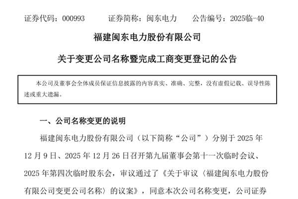 福建闽东电力股份有限公司(简称:闽东电力)分别于2025年12月9日、2025年12月26日召开第九届董事会第十一次临时会议、2025年第四次临时股东会,审议通过了《关于审议〈福建闽东电力股份有限公司变更公司名称〉的议案》,同意本次公司名称变更,公司证券简称和证券代码保持不变,并同意经理层根据市场监督管理局等行政管理部门的相关要求,全...